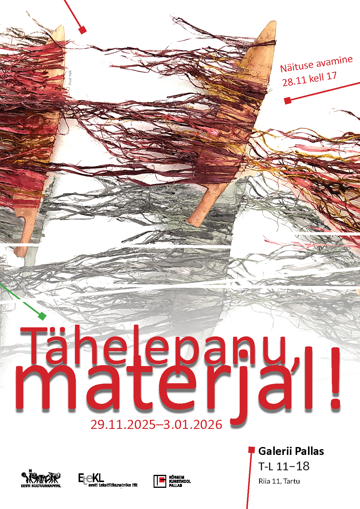 29.11.2025 – 3. 01.2026 on galeriis Pallas avatud Eesti Tekstiilikunstnike Liidu aastanäitus „Tähelepanu, materjal!“. Tänavune aastanäitus on pühendatud materjali tähendusele ja olulisusele kunstniku jaoks. 9. detsembril algusega kell 17 teevad näitusel galeriis Pallas tutvustava tuuri kuraator Aet Ollisaar ja kujundaja Madis Liplap.