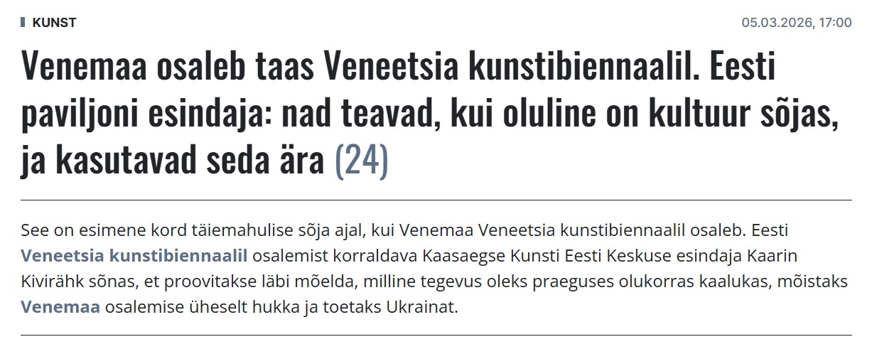 5.03.2026 Venemaa osaleb taas Veneetsia kunstibiennaalil. Eesti paviljoni esindaja: nad teavad, kui oluline on kultuur sõjas, ja kasutavad seda ära. Kultuur.delfi